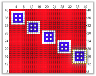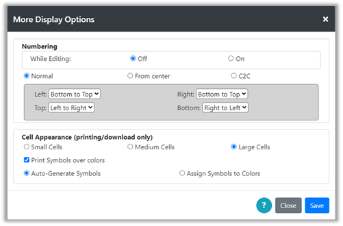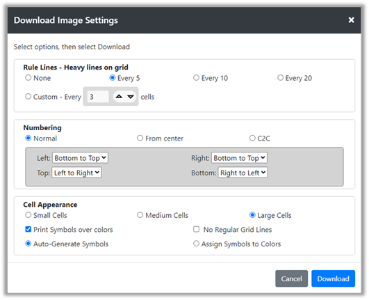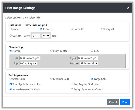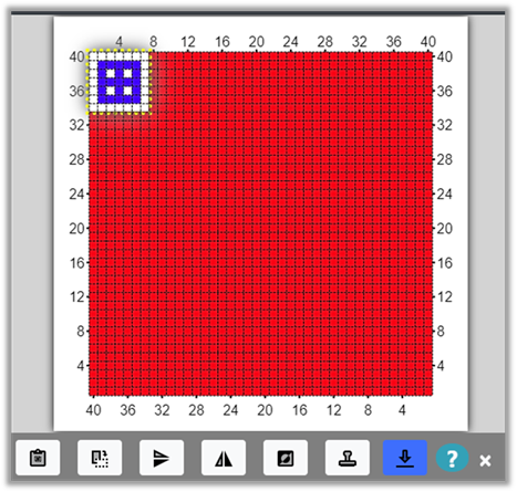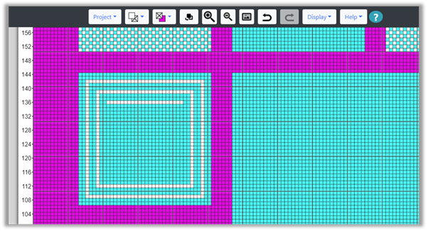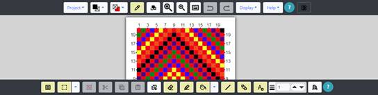 You may create a grid of up to 500 x 500 cells for each design. The cells of the grid can be either square or rectangular to correspond to whatever craft you are interested in. Multiple display options, such as numbering and mouse position, aid in working with your grid. Zoom in and zoom out are available as well as a zoom-full-picture that will size the grid to just-fit the editing window so that the complete design is visible.