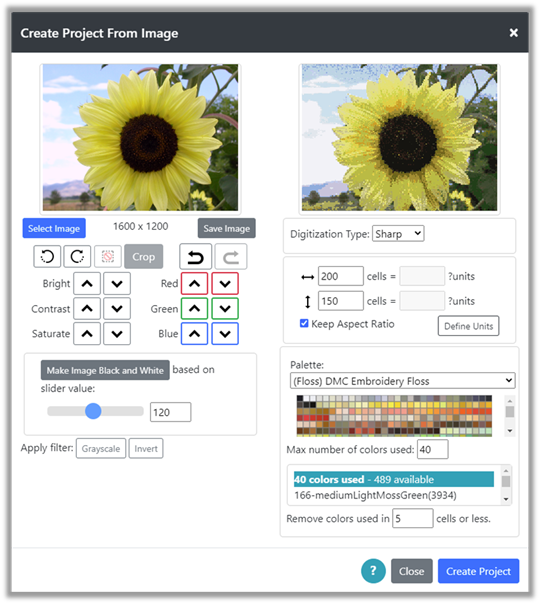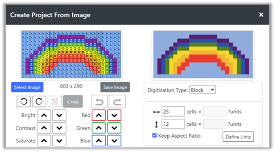 The New Project and the Create from Image options are used to create new projects. Use New Project to define the grid size, cell size and palette for a new project. Use Create from Image to create a project from a jpg or other image file.