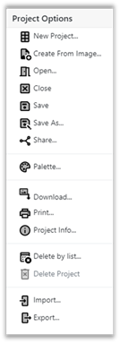 On the upper left of the top toolbar, you will find the Project menu. This appears as a button labeled project with a dropdown arrow on the right. Click the project menu button and you will find the following options: