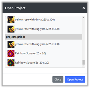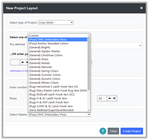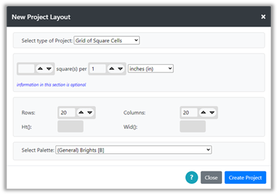 This dialog allows you to select the project type, define the size of that projects grid and select a palette for your project. Make selections for your project, as described in the following sections and then click the Create Project button to create your project grid.