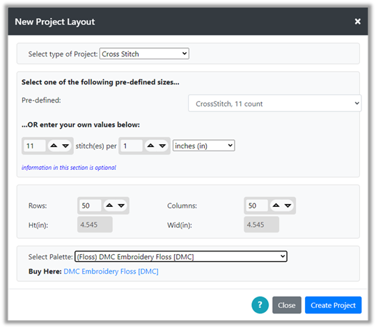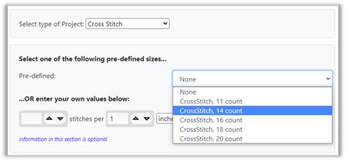 Once the project type is selected, the dialog will change to show more options for that project type. For instance, if Cross-stitch is selected as the project type, you can select from pre-defined settings as shown below, or you can enter your own sizing information in the form of number of stitches per inch or cm.