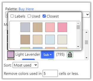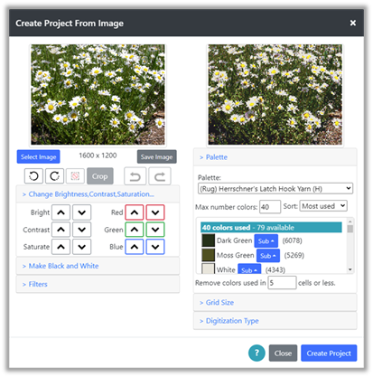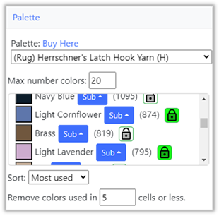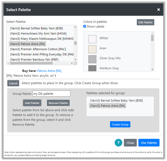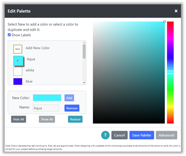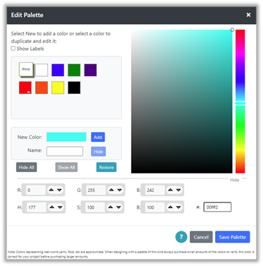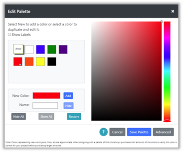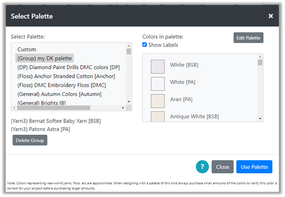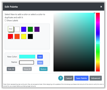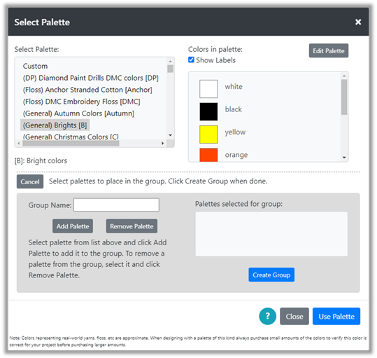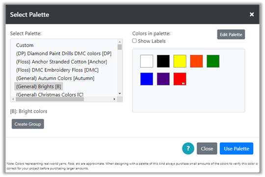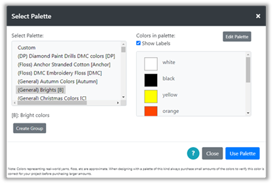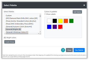 Select colors from many pre-defined palettes or add your own colors to any palette. Pre-defined palettes include many commonly used yarns, rug yarn, embroidery floss, etc. One custom palette is also provided where you can add any colors you would like to work with.