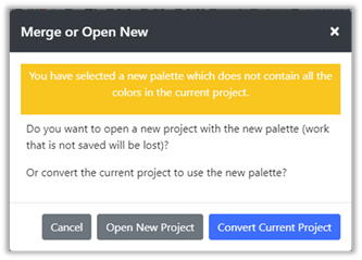 You can create a new empty project with the new palette, or you can convert the existing colors in your project to the new palette by selecting colors to substitute for the old colors.