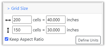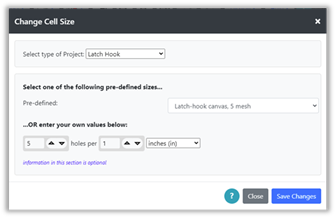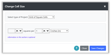 If you have defined the project type and cell size, you will also be able to see the size of your grid in real-world units such as inches or centimeters. In this case the Grid Size dialog will show those units in addition to the number of rows and columns. As you change the number of rows and columns, the height and width of the project will be recalculated: