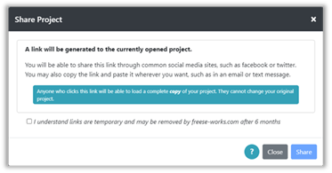 To Save your project, use the Save or Save As options. Any project you save can be opened again with the Open option. Projects can also be shared with others using the Share option. The Delete Project option deletes the currently open project and the Delete by List option presents you with a full list of all your projects so that you can delete old or unused projects.