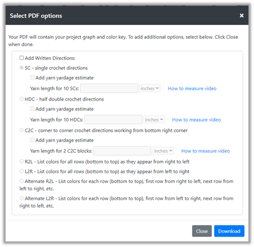 For example, suppose we select cross-stitch and 11 count fabric. This tells us the relationship between your project grid and real-world measurements of inches, because 11 count Aida cloth will have 11 stitches per inch. Then, the size in inches can be computed as you change the number of rows and columns. See the figure below; 50 rows and columns of stitches will be 4.545 inches or a little over 4 ½ inches.