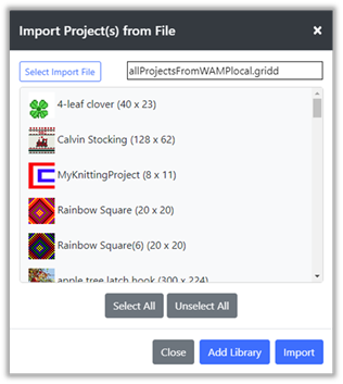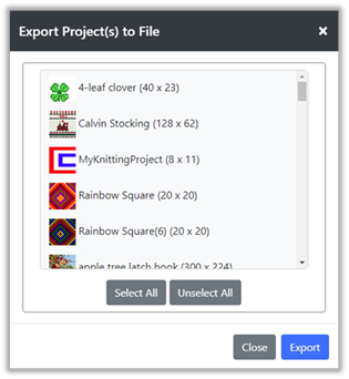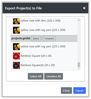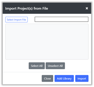 To export and import your projects to and from files on your local file system, use the Export and Import options at the bottom of the project menu. These can be used to make a backup file of your projects or to create your own library of projects.