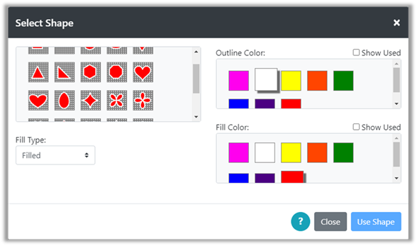 The shape tool allows the creation of simple shapes such as rectangles, circles, triangles, hexagons, diamonds, etc. These shapes can be created as solid shapes of a single color, outlined shapes where only the outline is drawn, or filled shapes with an outline of one color and fill of another color.