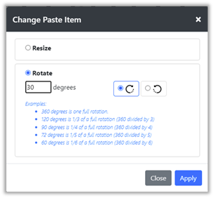 Complete support for selection , cut, copy, paste within the tool is provided. In addition, the paste contents can be modified with a series of tools that allow you to flip vertically and horizontally, invert colors, and rotate.