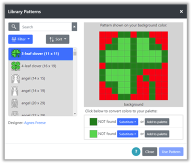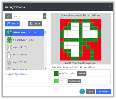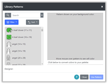 The Grid Designer can be used to create and edit any colored grid-based craft design. Some of its uses include: