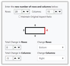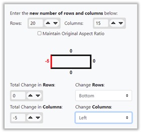 Suppose we have a 20 x 20 grid and suppose we need to remove 5 columns from the left side of the grid. Enter -5 through typing or by clicking the down arrow 5 times in the Total change in columns field. This will reduce the number of columns by 5.