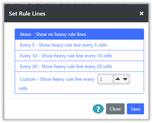 The default setting is None. You can select lines every 5, 10, or 20 cells and can also set a custom rule line spacing. Select the option you want from the dialog. If you select custom, enter the number of rows/columns to have between lines. Then click the Save button to update your grid.